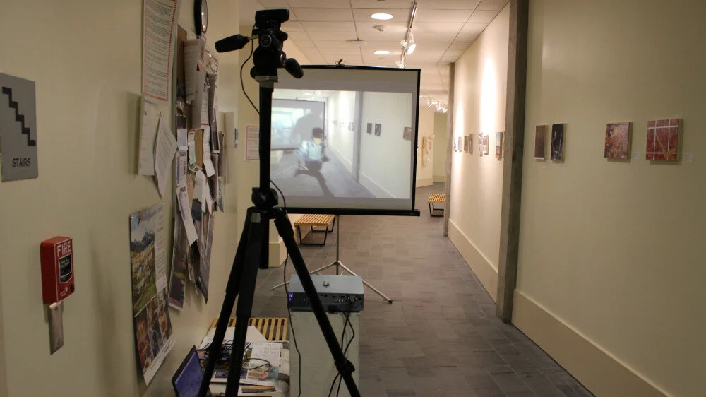 Tic, short for ‘nervous tic’ is an interactive video installation that captures and continuously loops one second of movement when a viewer walks in front of a projector and camera. The video installation projects a viewer’s recorded reaction to a previous viewer’s interaction, compounding waves of bewilderment. I borrowed strategies from Michaelangelo Pistoletto’s Mirror Paintings to implicate the viewer in a work, and anxieties about whether or not artists can directly convey meaning through art after reading Roland Barthes’ Death of the Author. I also wanted to make something funny and a tiny bit uncomfortable, like me.